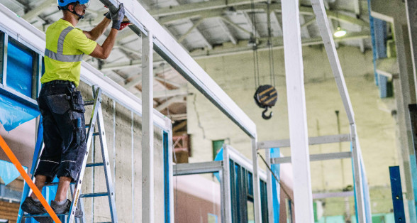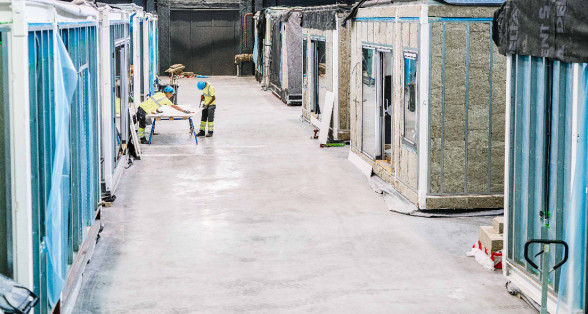 On production surfaces, in accordance with blueprints, the load-bearing elements of the panels are assembled, any engineering networks are installed, thermal insulation is put in and the panel receives an outer plating with sheet material. When the panel is completed to the set-out specifications, it is moved to the module assembly zone. Module assembly begins with the floor covering panel and moves upward. That is, the floor panel is fixed to the columns, then the wall panels get assembled, followed by conjoining the roof panel with the columns and wall panels. The module assembly process includes waterproofing of panel seams, to adhere to air non-permeability requirements and ensure higher energy efficiency.